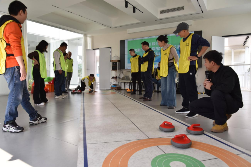 活动于上午10时正式拉开帷幕。简短的热身运动后,紧张刺激的室内拓展环节——旱地冰壶火热开启。在专业教练的带领下,员工分为两个小队,各小队成员全情投入,从陌生到熟练,精心策划每一次投掷。赛场上,既有凝神屏息的专注,也有打出精彩好球时的激情洋溢。这项运动不仅考验着个人的技巧与定力,更体现了团队的战术布局与协作精神,完美诠释了“谋定而后动”的智慧。